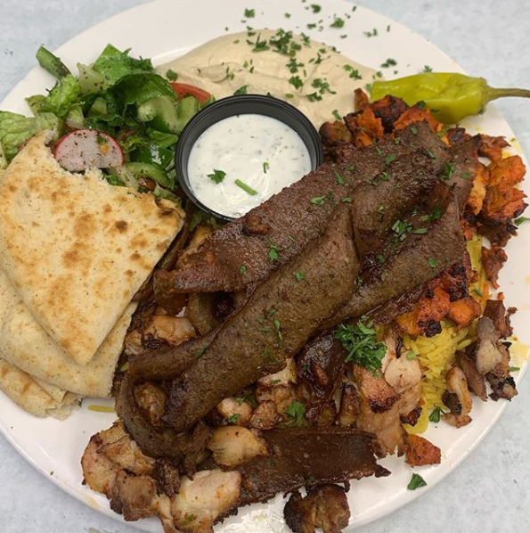 Beef, Chicken, or Lamb with a side dip of garlic sauce, rice, salad and hummus