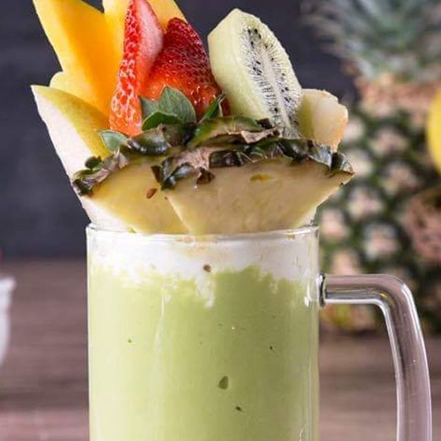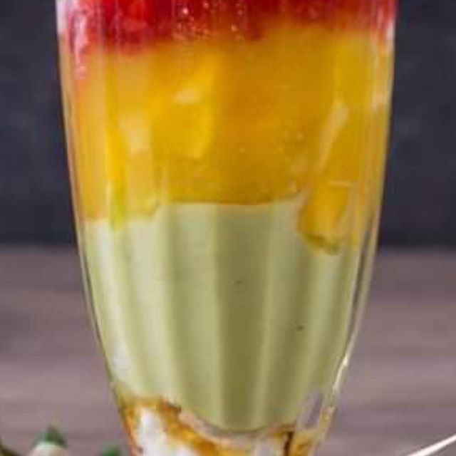Mixed fruits merged between layers of fresh strawberry & mango juices topped with fresh strawberry, kiwi, pineapple, almonds, ground pistachio, ashta cream & honey