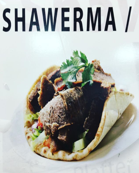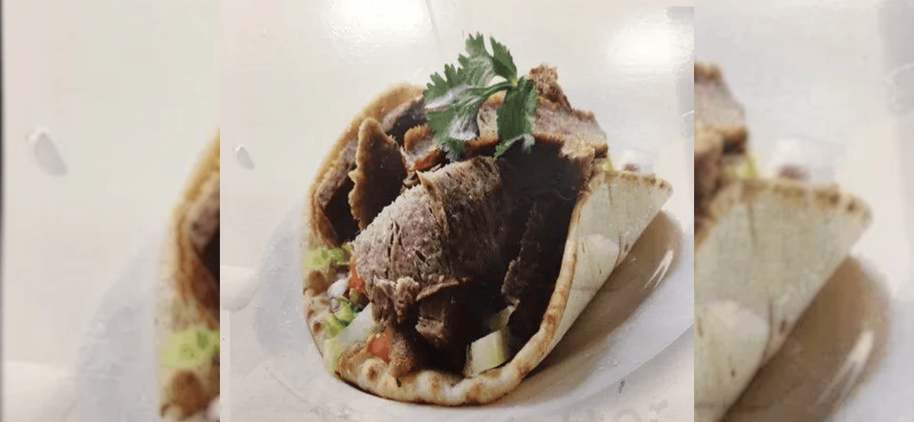 A kafta skewer grilled on a charcoal barbecue with hummus, fresh parsley, onion, turnips, pickles and tomato wrapped in pita bread